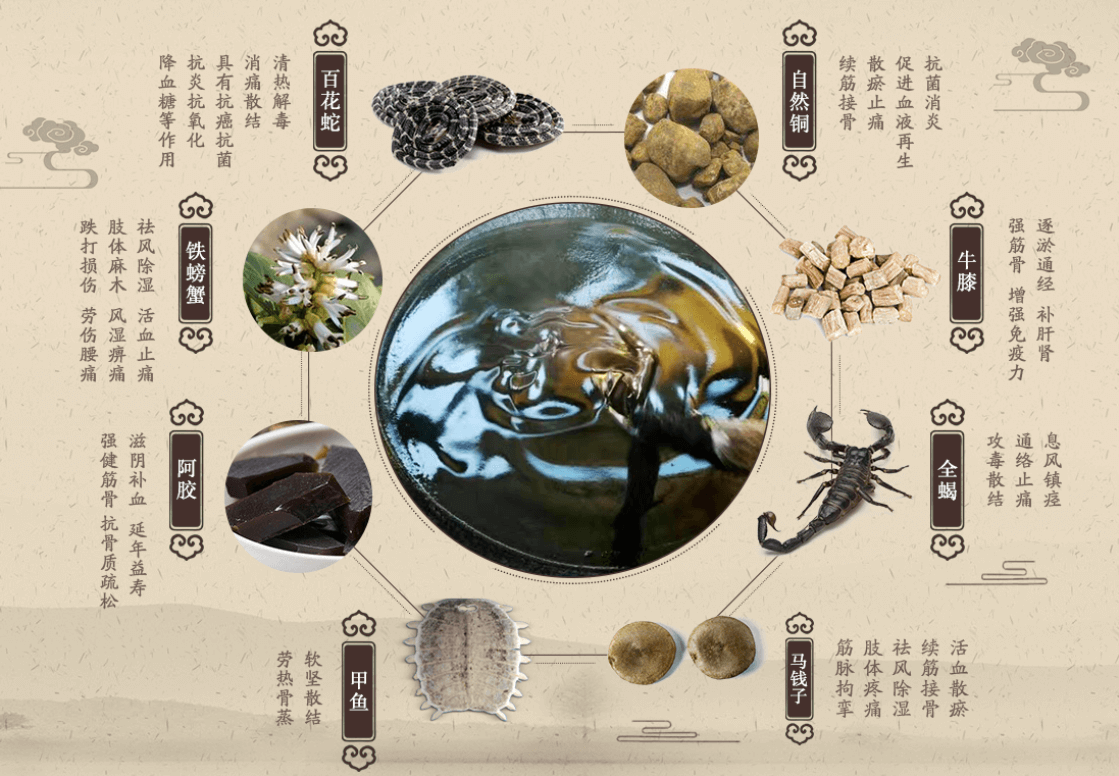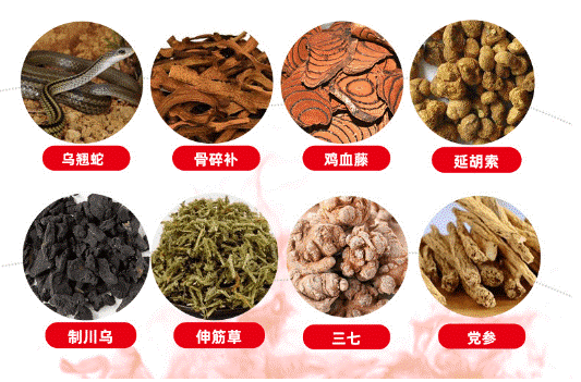 乳香 10g、 没药 10g、 细辛 10g、 冰片 5g、 八角枫 10g、 生草乌 10g、 四块瓦 10g、 生川乌 10g、 雪上一枝蒿 10g、 桑寄生 20g、 五香血藤 20g、 独活 20g、 透骨草 20g、 伸筋草 20g、 生地黄 10g、 熟地黄 10g、 续断 10g、 红花 10g、 土茯苓 20g、 海螵蛸 10g、 当归 20g、 苏木 20g、 白芷 10g、 猴骨 20g、 重楼 10g、 海马 1g、 木鳖子 10g、 马前子 10g、 三分三 10g、 黄芪 20g、 三七 10g、 骨碎补 10g、 淫羊藿 10g、 千年健 10g、 杜仲 10g、 海风藤 10g、 刺五加 10g、 钻地风 10g、 牛膝 10g、 血竭 10g、 白术 10g、 肉桂 10g、 苍术 10g、 党参 10g、 茯苓 10g、 秦艽 10g、 仙鹤草 10g、 苦参 10g、 地肤子 10g、 鹤虱 10g、 黄连 10g、 黄芩 10g、 黄柏 10g、 大黄 20g、 银花 10g、 威灵仙 10g、 赤芍 10g、 蕲蛇 10g