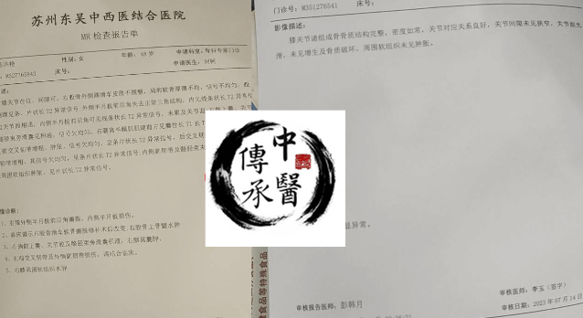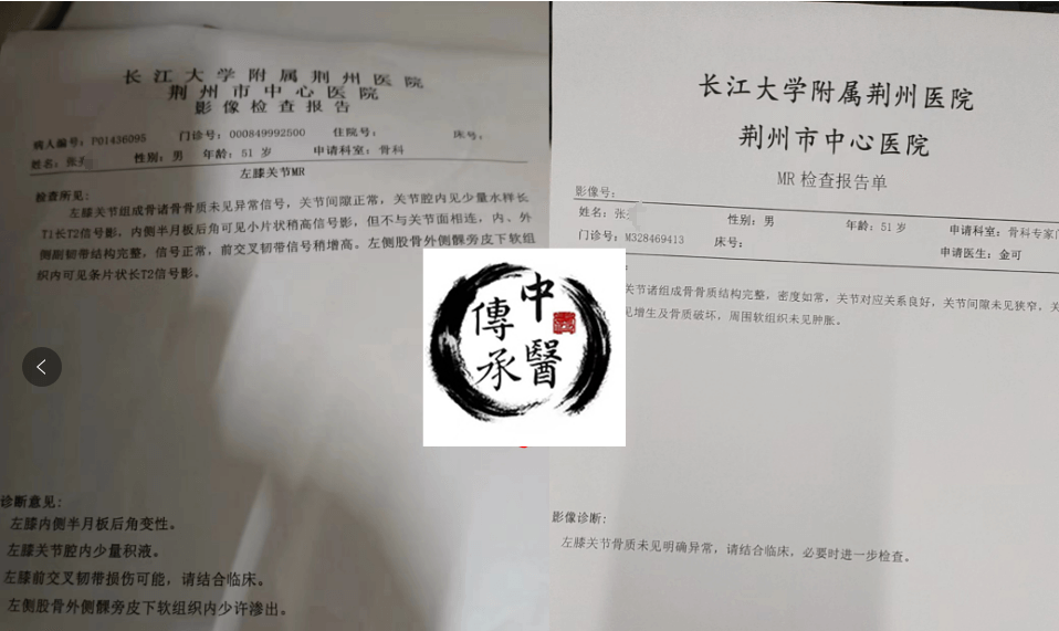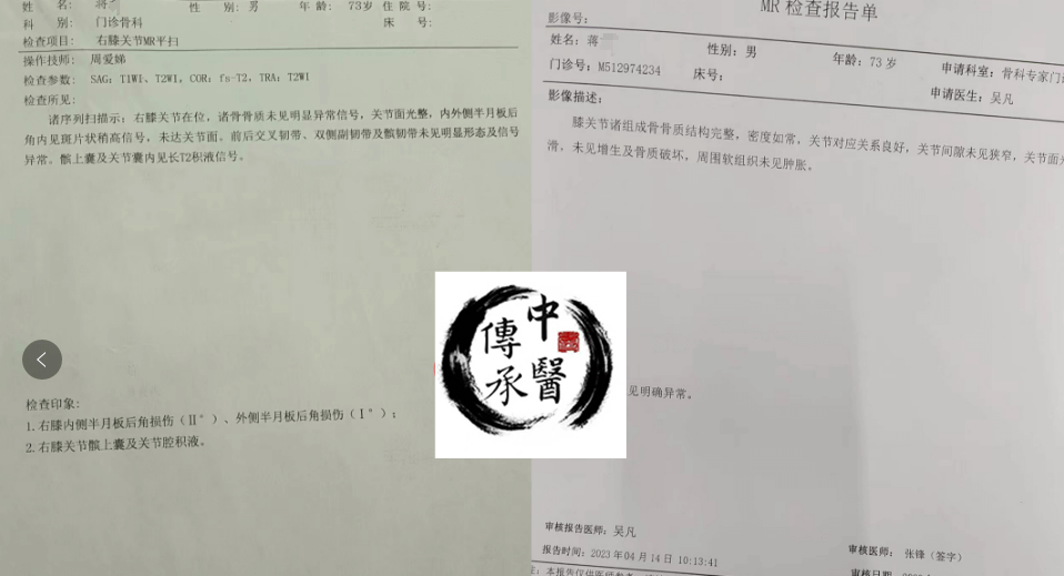 左膝外侧盘状半月板前角撕裂,双膝关节腔以及髌上囊少量积液, 一个同事向她推荐建议她试试【中医传承】。差不多坚持了1个多月后,每次走个三五里地很轻松简单也没啥问题了,活动自如...真的很感谢老师!